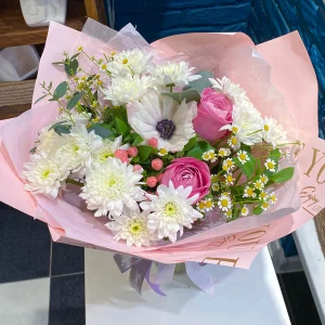 Улыбка весны – букет с кустовыми розами и хризантемами
