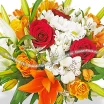 Уменьшенный: лилия желтая - 1 шт., роза желтая - 3 шт., роза красная - 2 шт., альстромерия белая - 2 шт., хризантема кустовая ромашковая (белая) - 1 шт., сетка желтая.