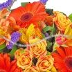 ДЕЛЮКС: гербера оранжевая - 9 шт, роза кустовая оранжевая - 7 шт, альстромерия оранжевая - 11 шт, статица фиолетовая - 5 шт, рускус,фетр зеленый.