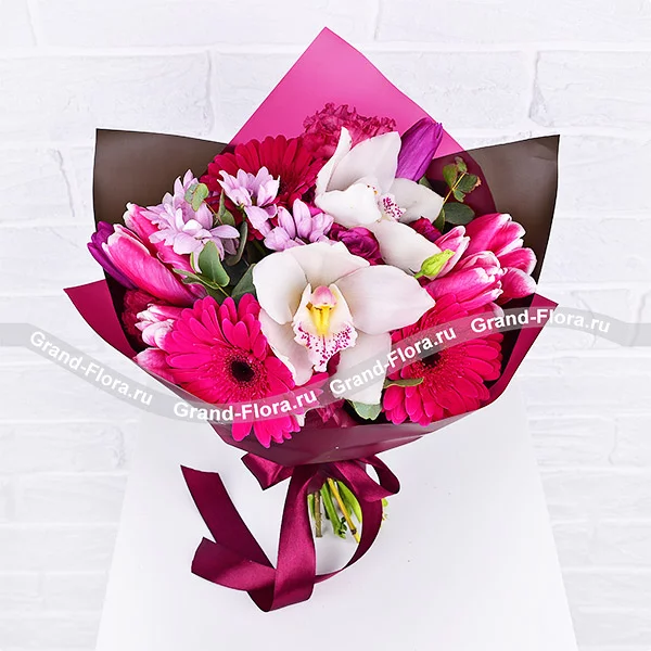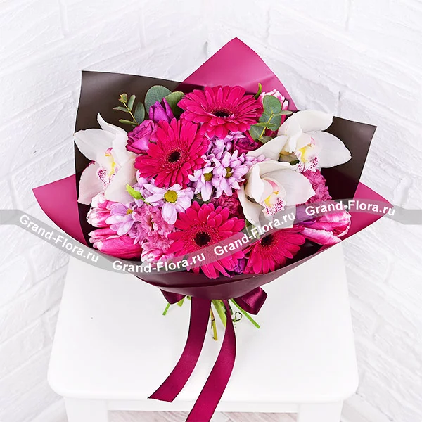 Стандартный: орхидея белая - 2 шт., гербера малиновая - 3 шт., хризантема кустовая розовая - 2 шт., эустома розовая - 3 шт., тюльпан розовый - 3 шт., тюльпан фиолетовый - 2 шт., роза кустовая фиолетовая - 2 шт., эвкалипт, упаковка, лента. Примерный размер: 30Х30 см. (тюльпаны не в сезон заменяются на розы, эустому или альстромерии в зависимости от свежей поставки)