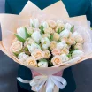 ДЕЛЮКС: тюльпаны белые - 35 шт., роза кустовая кремовая(розовая) - 20 шт., упаковка, лента